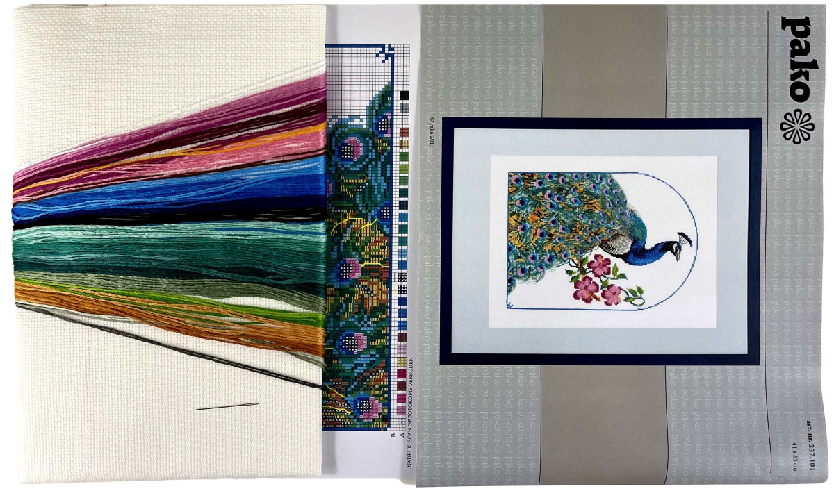 Beautiful cross-stitch kit peacock with his tail sweeping behind.