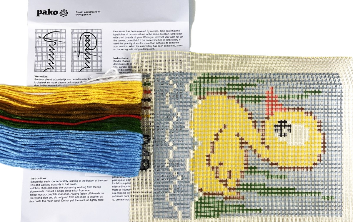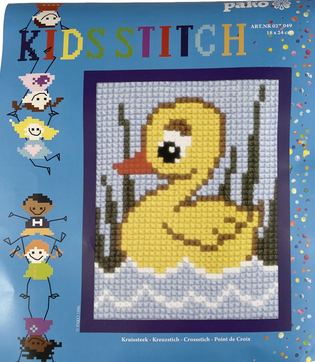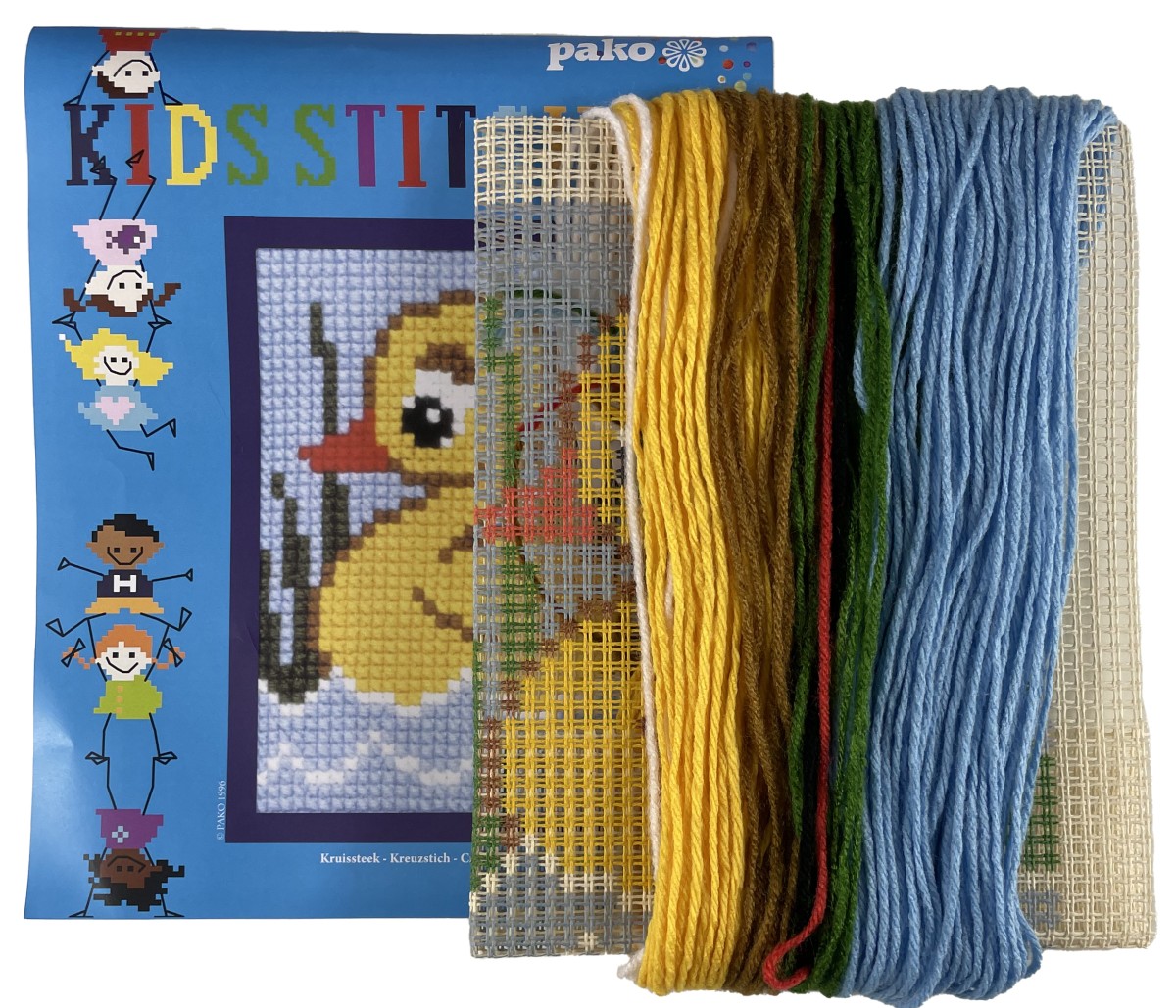 Helemaal compleet en eenvoudig borduurpakket van een eendje. Kinderen leren