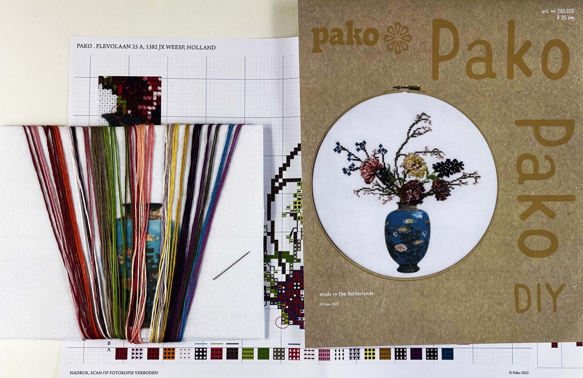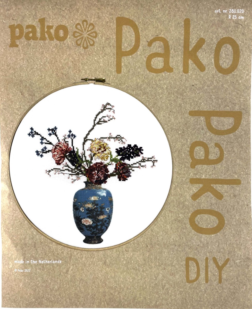Borduurpakket / kruissteek pakket van een oude japanse vaas met een mooi boeket bloemen. Een prachtige combinatie van klassiek en modern en borduren op geprinte stof.