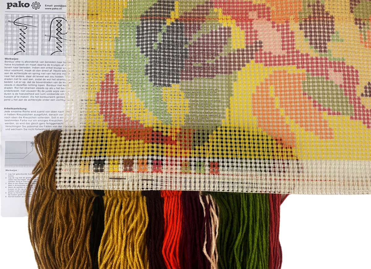 Het borduurpakket wordt geleverd inclusief stramien,borduurwol, naald en instructies, exclusief kussenrug. De kussenvulling is er altijd bij te bestellen.